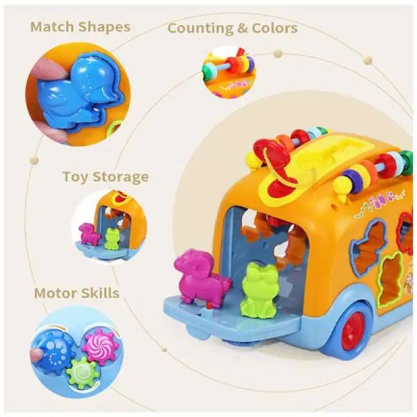 دارای لگوهای مختلف با طرح حیوانات است که کودک باید آنها را در جای مخصوص خود روی اتوبوس بگذارد.