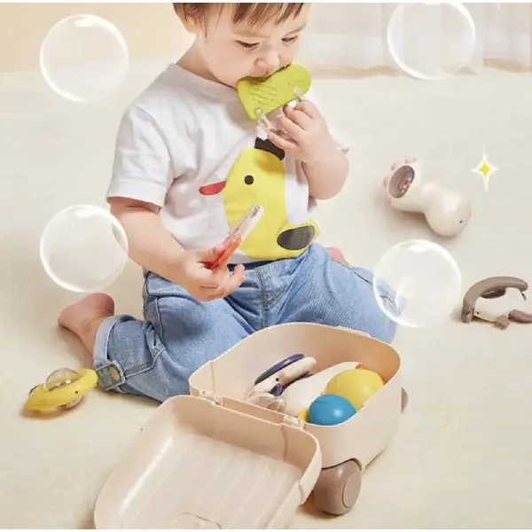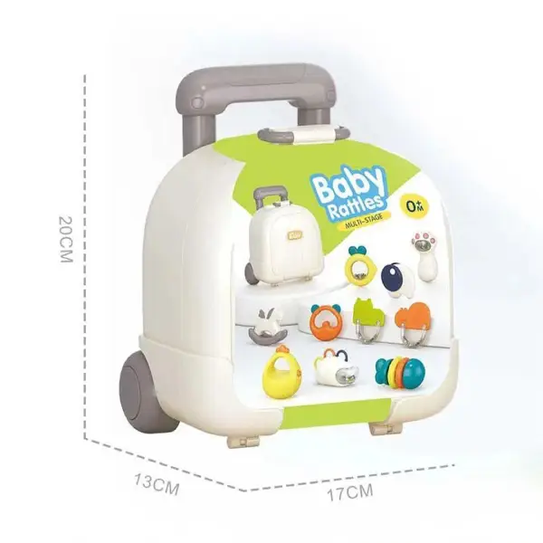 یکی از زیباترین و جدیدترین محصولات برند Viva kids که با بسته بندی زیبا چمدان به بازار عرضه شده، دارای ست کامل 8 عددی جغجغه و دندان گیر میباشد.