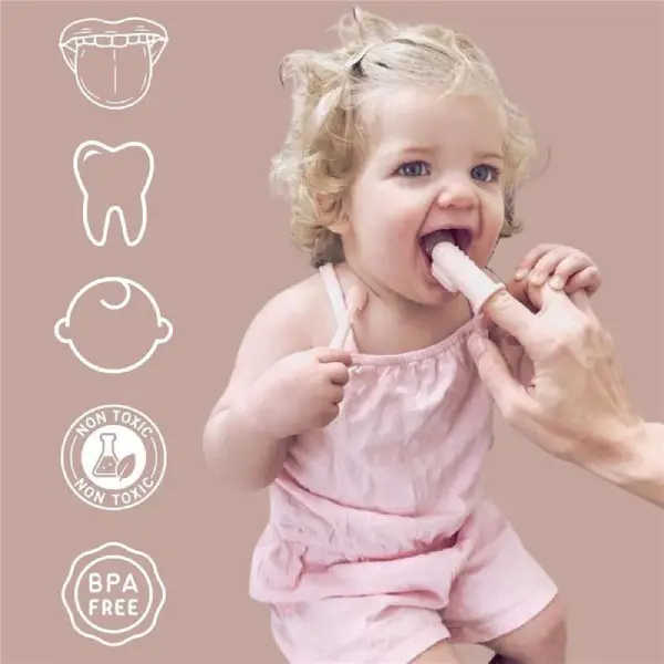 یک مسواک انگشتی برای تمیز کردن دندان ها و لثه نوزاد از بدو تولد دارد.