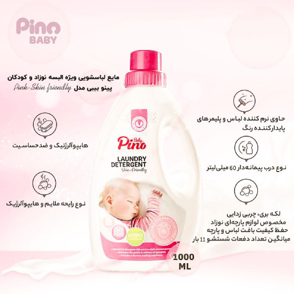 مایع لباسشویی پینو بیبی به صورت تخصصی برای شستشوی لباس، ملحفه و کلیه لوازم پارچهای نوزادان از بدو تولد و کودکان در دو رنگ صورتی و آبی در حجم ۱۰۰۰ گرمی طراحی شده است.